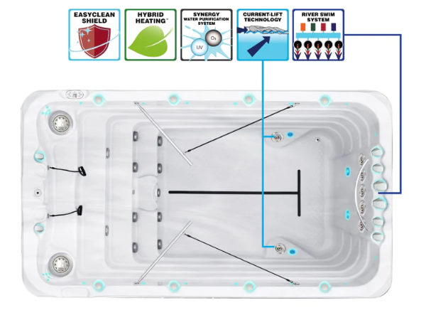 Passion Spas pioneers Current-Lift Technology™, allowing swimmers to stay afloat at varying current levels. It adapts automatically to your workout, optimizing water flow.